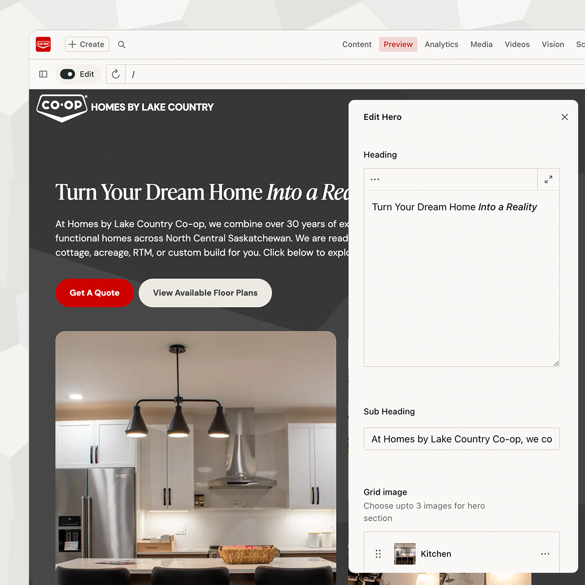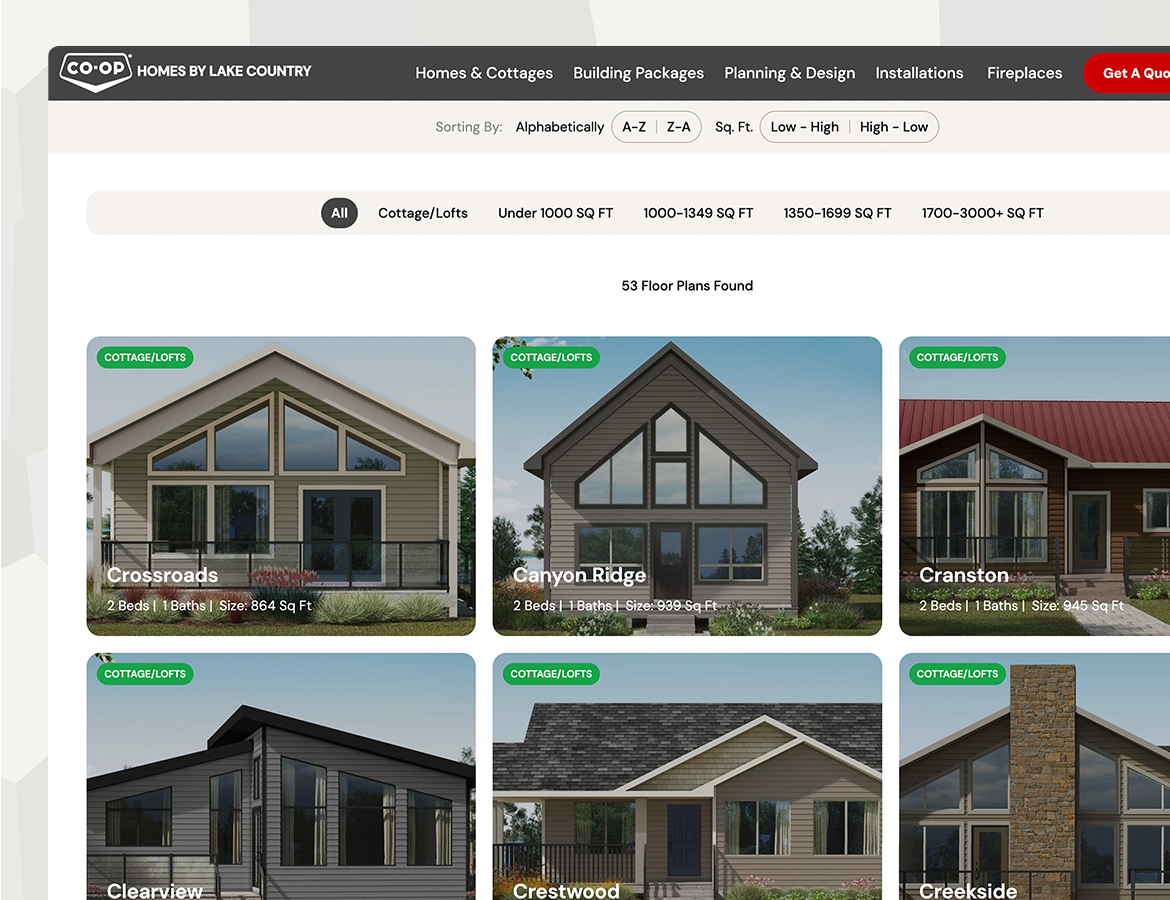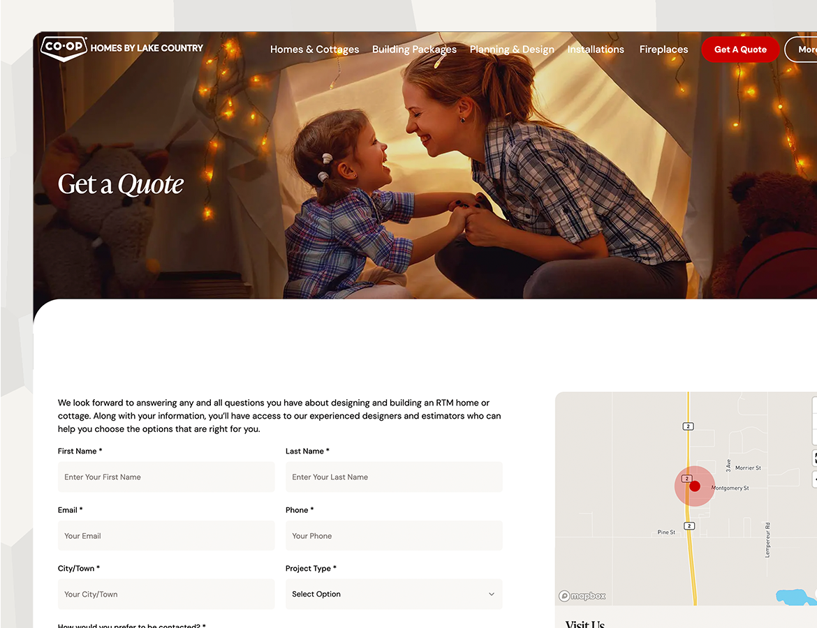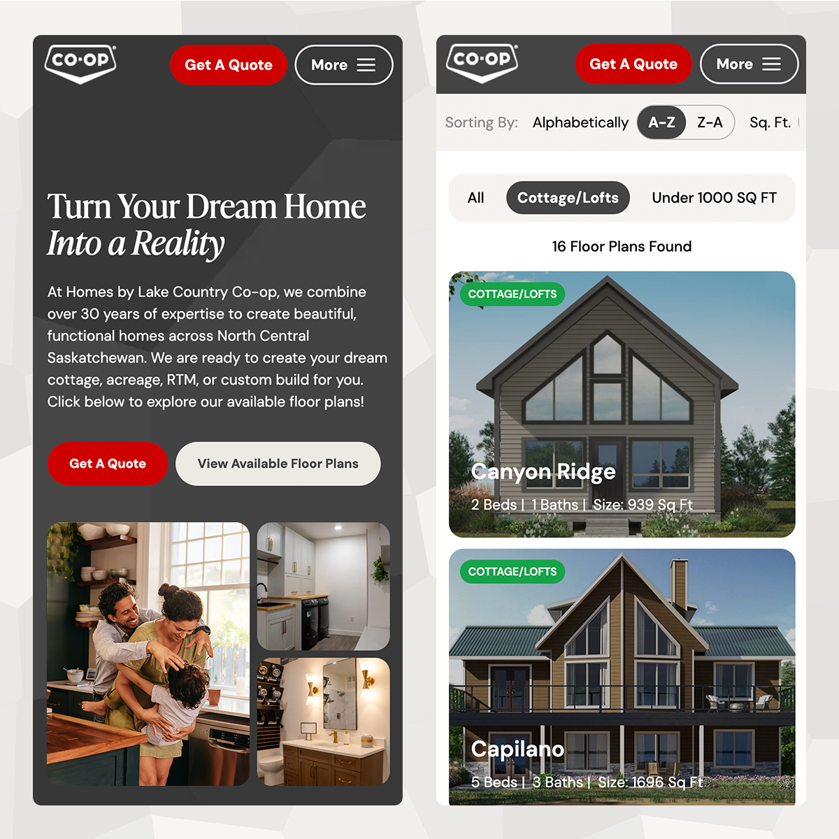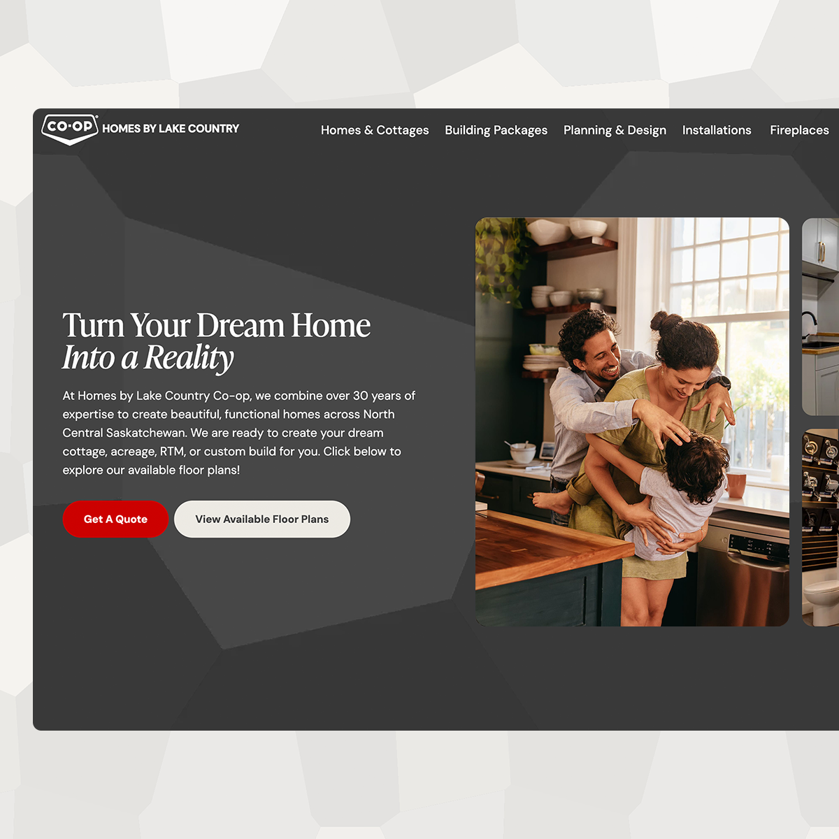 Lake Country Co-op has a rich history in Saskatchewan and Western Canada. With the website design, we aimed to authentically capture and showcase that legacy to the fullest. Buying a home is often one of the most significant milestones in a person's life. The first step to that milestone is contacting a reputable and trusted builder. Therefore, showcasing trust and professionalism throughout the website was essential. Our goal was to paint a picture for potential clients of what their dream home could look like—the memories they’d create, the milestones they’d celebrate, and the family they’d grow.
