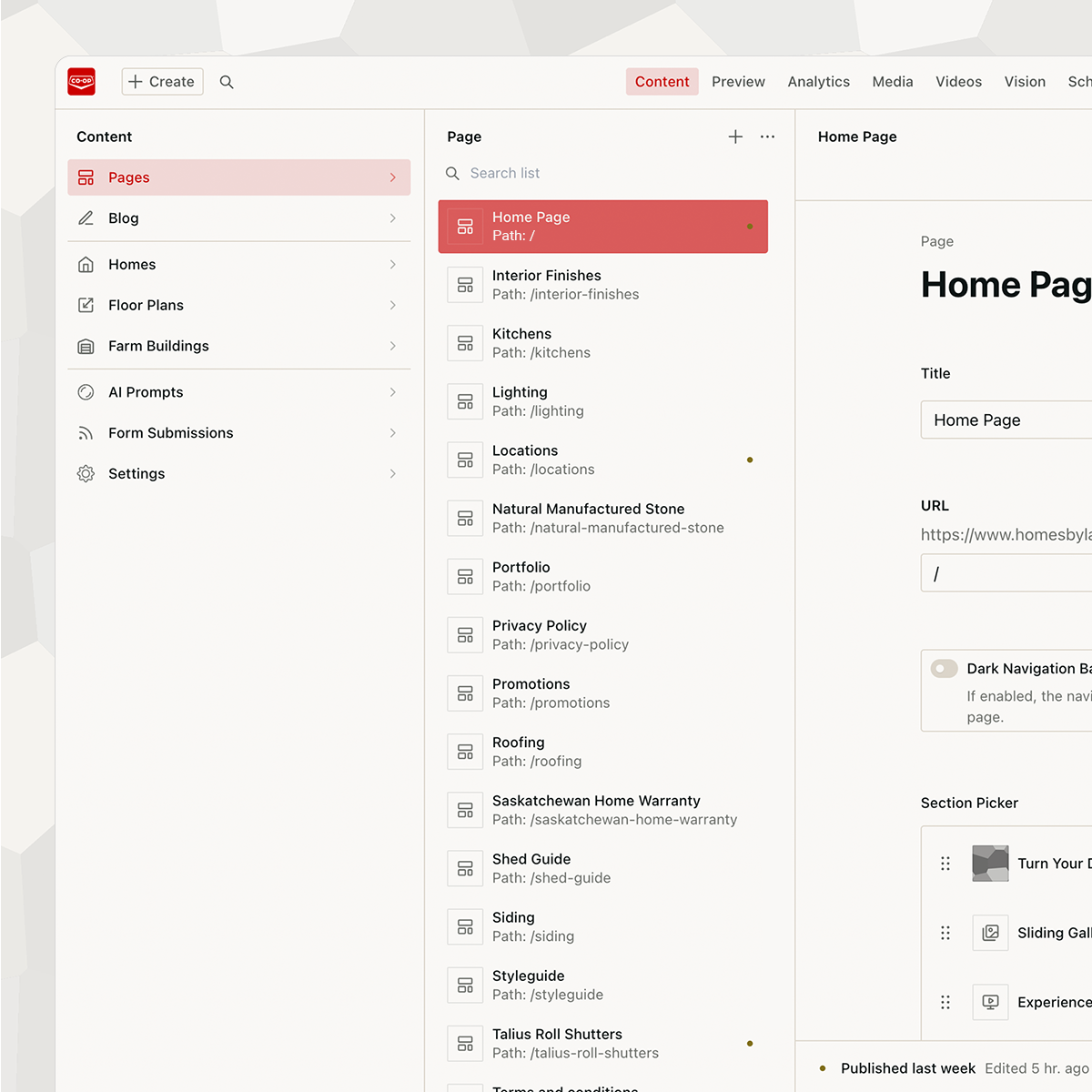 No two businesses are the same, therefore an out-of-the-box Content Management System (CMS) is rarely an ideal solution. For Homes By Lake Country, their previous WordPress CMS website was cluttered and disorganized making it difficult to update content. For the new website, we integrated Sanity CMS to provide visual editing capabilities and a streamlined content management system, allowing the team to locate and update any piece of content within just a few clicks.